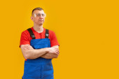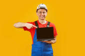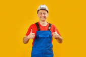 Zdjęcie wesołego optymistycznego młodego pracownika lub budowniczego w niebieskim mundurze odizolowanego na żółtym tle i pokazuje kciuki w górę. Przestrzeń kopiowania