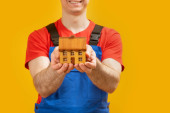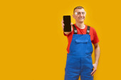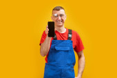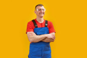 Zdjęcie "Zdjęcie wesołego optymistycznego młodego pracownika lub budowniczego w niebieskim mundurze odizolowanego na żółtym tle i pokazuje kciuki w górę. Przestrzeń kopiowania" może być wykorzystywane do celów osobistych i komercyjnych zgodnie z warunkami zakupionej licencji Royalty-free. Obraz jest dostępny do pobrania w jakości wysokiej rozdzielczości do 5760x3840.