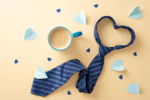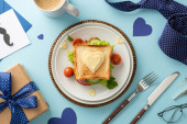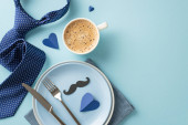 Pięknie zaaranżowane nakrycie stołu Dnia Ojca z płaskim daniem, kopertą, pocztówką z wąsami, serwetką, krawatem, kawą na pastelowym niebieskim tle z pustym miejscem na tekst lub reklamę