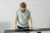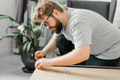 Brodaty tysiącletni człowiek montuje swoją biblioteczkę. Używa narzędzi do mebli. Meble do apartamentów w pokojach wewnętrznych