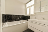 Zdjęcie "łazienka z WC, umywalka i kabina prysznicowa na zdjęciu pochodzi z przodu pokoju" może być wykorzystywane do celów osobistych i komercyjnych zgodnie z warunkami zakupionej licencji Royalty-free. Obraz jest dostępny do pobrania w jakości wysokiej rozdzielczości do 5760x3840.