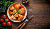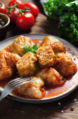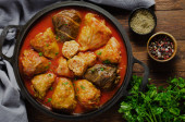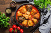 Homemade Cabbage rolls with meat, rice and vegetables. Stuffed cabbage leaves also known as sarma, golubtsy, dolma on Dark Rustic Background