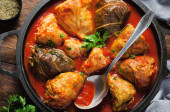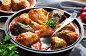 Zdjęcie "Homemade Cabbage rolls with meat, rice and vegetables. Stuffed cabbage leaves also known as sarma, golubtsy, dolma on Dark Rustic Background" może być wykorzystywane do celów osobistych i komercyjnych zgodnie z warunkami zakupionej licencji Royalty-free. Obraz jest dostępny do pobrania w jakości wysokiej rozdzielczości do 5760x3840.