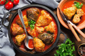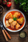 Homemade Cabbage rolls with meat, rice and vegetables. Stuffed cabbage leaves also known as sarma, golubtsy, dolma on Dark Rustic Background