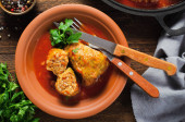 Zdjęcie "Homemade Cabbage rolls with meat, rice and vegetables. Stuffed cabbage leaves also known as sarma, golubtsy, dolma on Dark Rustic Background" może być wykorzystywane do celów osobistych i komercyjnych zgodnie z warunkami zakupionej licencji Royalty-free. Obraz jest dostępny do pobrania w jakości wysokiej rozdzielczości do 5760x3840.