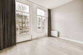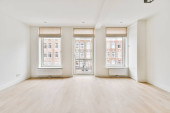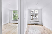 pusty pokój z drewnianymi podłogami i białymi ścianami, z widokiem na ulicę z jednej strony na drugą