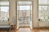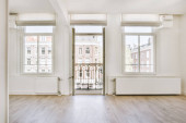 Zdjęcie "pusty pokój z drewnianymi podłogami i białymi ścianami, z widokiem na ulicę z jednej strony na drugą" może być wykorzystywane do celów osobistych i komercyjnych zgodnie z warunkami zakupionej licencji Royalty-free. Obraz jest dostępny do pobrania w jakości wysokiej rozdzielczości do 5760x3840.