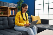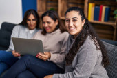 Zdjęcie "Three woman using laptop sitting on sofa at home" może być wykorzystywane do celów osobistych i komercyjnych zgodnie z warunkami zakupionej licencji Royalty-free. Obraz jest dostępny do pobrania w jakości wysokiej rozdzielczości do 5760x3840.