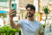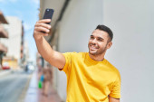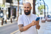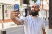 młody łysy człowiek uśmiechnięty pewnie robi selfie przez smartfona na ulicy