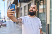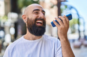 Zdjęcie "młody łysy człowiek uśmiechnięty pewnie robi selfie przez smartfona na ulicy" może być wykorzystywane do celów osobistych i komercyjnych zgodnie z warunkami zakupionej licencji Royalty-free. Obraz jest dostępny do pobrania w jakości wysokiej rozdzielczości do 5760x3840.