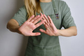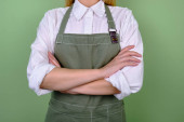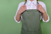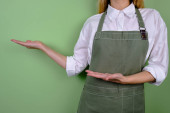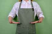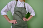 Kobieta w fartuchu kuchennym. Szef kuchni pracuje w kuchni. Kucharz w mundurze, odzież ochronna. Praca w gastronomii. Profesjonalna kuchnia. Fartuch z zielonego materiału, luźne ubranie. Przystojny piekarz pozowanie