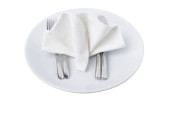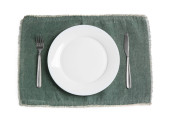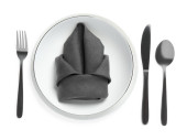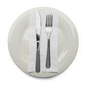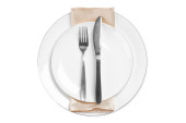 Ceramic plate, fork and knife on white background, top view