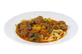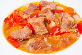 gulasz wołowy w sosie pomidorowym tradycyjne gruzińskie danie chashushuli biały tło widok z góry. Wysokiej jakości zdjęcie