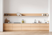 Widok z przodu na jasne wnętrze łazienki z dużym lustrem, półki z ręcznikami, okrągłe lustro, naczynia, stołek, dywan, zlewozmywaki, białe ściany, dąb drewniana podłoga z drewna liściastego, kran. 3d renderowanie