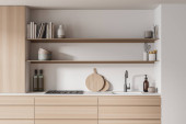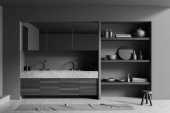 Zdjęcie "Widok z przodu na jasne wnętrze łazienki z dużym lustrem, półki z ręcznikami, okrągłe lustro, naczynia, stołek, dywan, zlewozmywaki, białe ściany, dąb drewniana podłoga z drewna liściastego, kran. 3d renderowanie" może być wykorzystywane do celów osobistych i komercyjnych zgodnie z warunkami zakupionej licencji Royalty-free. Obraz jest dostępny do pobrania w jakości wysokiej rozdzielczości do 5760x3840.