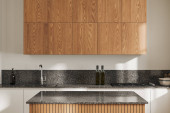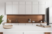 Zdjęcie "Białe wnętrze kuchni z umywalką, bocznym widokiem, kuchenką i nowoczesnymi przyborami kuchennymi. Kuchnia w minimalistycznym studio hotelowym. Renderowanie 3D" może być wykorzystywane do celów osobistych i komercyjnych zgodnie z warunkami zakupionej licencji Royalty-free. Obraz jest dostępny do pobrania w jakości wysokiej rozdzielczości do 5760x3840.