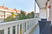 podwórko z ławkami, stołami i parasolami na patio przed apartamentowcem otoczonym drzewami