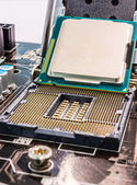 Mikroprocesor CPU na gnieździe płyty głównej. Koncepcja technologii komputerowej i naprawy sprzętu, laboratorium mikroprocesorowe, inżynier techniczny, komputer naprawczy, chip elektroniczny,