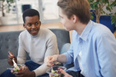 Zdjęcie "Portret dwojga kreatywnych młodych ludzi śmiejących się razem podczas pracy nad projektem" może być wykorzystywane do celów osobistych i komercyjnych zgodnie z warunkami zakupionej licencji Royalty-free. Obraz jest dostępny do pobrania w jakości wysokiej rozdzielczości do 5760x3840.
