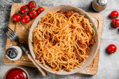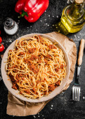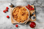 Zdjęcie "Bolognese spaghetti w talerzu na stole z pomidorami. Na drewnianym tle. Wysokiej jakości zdjęcie" może być wykorzystywane do celów osobistych i komercyjnych zgodnie z warunkami zakupionej licencji Royalty-free. Obraz jest dostępny do pobrania w jakości wysokiej rozdzielczości do 5760x3840.