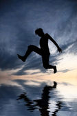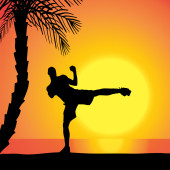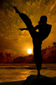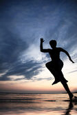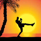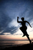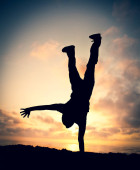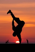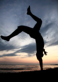 akrobatyczne mężczyzn na plaży o zachodzie słońca.