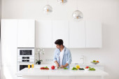 Zdjęcie "Gotowane w domu szczęście. Szczęśliwy czarny człowiek gotuje rozmawiając przez telefon i uśmiechając się do swojego psa zwierzaka stojącego w nowoczesnej kuchni. Guy cieszący się przygotowaniem obiadu w weekend, komunikowanie się przez telefon komórkowy" może być wykorzystywane do celów osobistych i komercyjnych zgodnie z warunkami zakupionej licencji Royalty-free. Obraz jest dostępny do pobrania w jakości wysokiej rozdzielczości do 5760x3840.