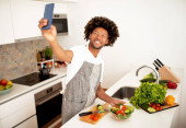 Gotowanie w domu. Wesoły czarny facet jedzący domową kolację, przynoszący widelec do ust, cieszący się smakiem i smakiem posiłku w nowoczesnej kuchni w domu, noszący fartuch. Zdrowe odżywianie
