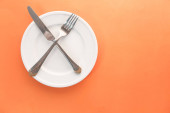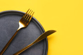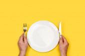 Kobiece dłonie z pustym talerzem i sztućcami na żółtym tle