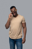 Zdjęcie "Modny Afrykański Amerykanin w okularach przeciwsłonecznych i dżinsowej kamizelce, siedzący na kamieniu i pozujący na szarym z niebieskim prześcieradłem poliwęglanowym na tle, sesja modowa, zrównoważona moda, odzież DIY" może być wykorzystywane do celów osobistych i komercyjnych zgodnie z warunkami zakupionej licencji Royalty-free. Obraz jest dostępny do pobrania w jakości wysokiej rozdzielczości do 5760x3840.