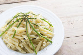 Zdjęcie "Kremowa cytryna Szparagi Makaron fettuccine zbliżenie na talerzu na drewnianym stole. Poziomy widok z góry z góry" może być wykorzystywane do celów osobistych i komercyjnych zgodnie z warunkami zakupionej licencji Royalty-free. Obraz jest dostępny do pobrania w jakości wysokiej rozdzielczości do 5760x3840.
