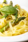 Kremowa cytryna Szparagi Makaron fettuccine zbliżenie na talerzu na drewnianym stole. Poziomy widok z góry z góry