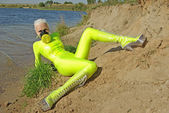 Pani w czarny guma lateks catsuit i jej niewolnicy
