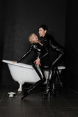 Zdjęcie "Pani w czarny guma lateks catsuit i jej niewolnicy" może być wykorzystywane do celów osobistych i komercyjnych zgodnie z warunkami zakupionej licencji Royalty-free. Obraz jest dostępny do pobrania w jakości wysokiej rozdzielczości do 5760x3840.