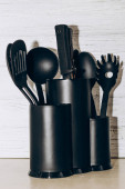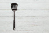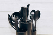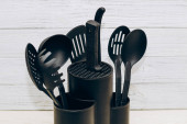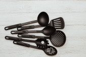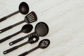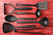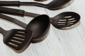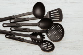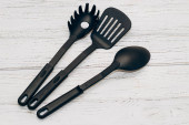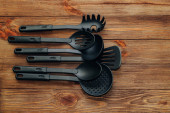 Narzędzia kuchenne plastikowe do wielokuchenki na drewnianym stole