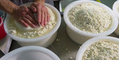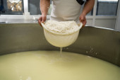 Świeżo wyprodukowany ser leży w pojemniku w fabryce serów.