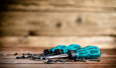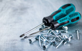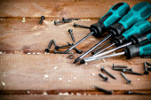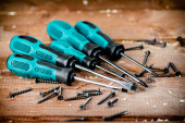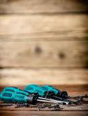 Manual screwdrivers on the table. On a wooden background. High quality photo