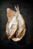 Suszone ryby, piwna przekąska. Na tle rustykalnym.