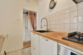 aneks kuchenny ze stołem i krzesłami przed ladą, jest otwarte okno na zewnątrz