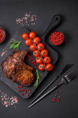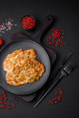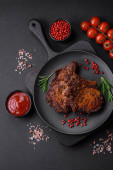 Pyszne smażony kurczak w sosie z cebulą, sól, przyprawy i zioła na ciemnym tle betonu