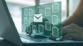 Marketing elektroniczny, centrum danych i reklama internetowa. Wysyłanie dokumentów drogą elektroniczną za pomocą poczty elektronicznej na laptopie.