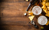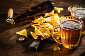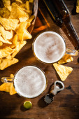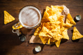 Świeże piwo z chipsami kukurydzianymi. Na tle rustykalnym.