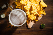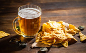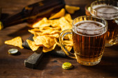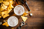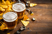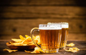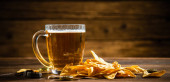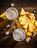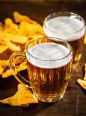 Świeże piwo z chipsami kukurydzianymi. Na tle rustykalnym.