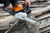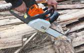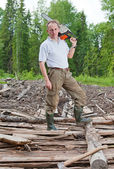 zaskoczony, człowiek z piłą łańcuchową w lecie drewna