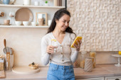 Latynoska dorosła kobieta pijąca detoks lub zielony sok w kuchni w domu w Meksyku Ameryka Łacińska, latynoska kobieta