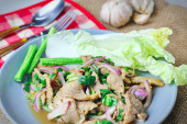 Zdjęcie "Sałatka z grilla, jedzenie Isaana w Tajlandii, lokalne jedzenie w Tajlandii. Podawany z fasolą i sałatą na szarym talerzu serwowanym w tajskiej restauracji." może być wykorzystywane do celów osobistych i komercyjnych zgodnie z warunkami zakupionej licencji Royalty-free. Obraz jest dostępny do pobrania w jakości wysokiej rozdzielczości do 5760x3840.