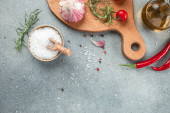 Koncepcja gotowania zdrowia, Stół gotowania z ziołami, przyprawy, baner, menu, miejsce na tekst, widok z góry,