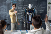 Zdjęcie "Biały nastolatek ściskający dłoń robotowi przy tablicy w klasie. Nauka technologii. Koncepcja robotyki. Szkoła o ed-tech. Zajęcia z nauczycielem androidów. Wykładowca humanoidów." może być wykorzystywane do celów osobistych i komercyjnych zgodnie z warunkami zakupionej licencji Royalty-free. Obraz jest dostępny do pobrania w jakości wysokiej rozdzielczości do 5760x3840.