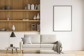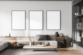 Wnętrze nowoczesnego salonu z białymi ścianami, drewniana podłoga, wygodna szara kanapa z pionowym plakatem makiety wiszące nad nim i biblioteczka. 3d renderowanie