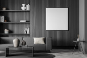 Zdjęcie "Wnętrze nowoczesnego salonu z białymi ścianami, drewniana podłoga, wygodna szara kanapa z pionowym plakatem makiety wiszące nad nim i biblioteczka. 3d renderowanie" może być wykorzystywane do celów osobistych i komercyjnych zgodnie z warunkami zakupionej licencji Royalty-free. Obraz jest dostępny do pobrania w jakości wysokiej rozdzielczości do 5760x3840.