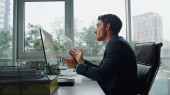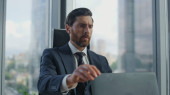 Pewny siebie brodaty biznesmen kończy pracę na laptopie zamykając pokrywę notebooka. Stylowy menadżer wstający z drewnianego biurka robi sobie przerwę. Poważny szef patrząc na panoramiczne okno nowoczesne biuro w drapaczu chmur.